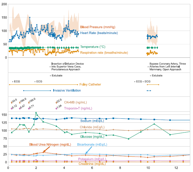 - 맨 밑에는 laboratory measurements 표시. ICU에서만 vital sign을 자주 측정하지만, lab measurement는 입원기간 내내 사용가능하다.