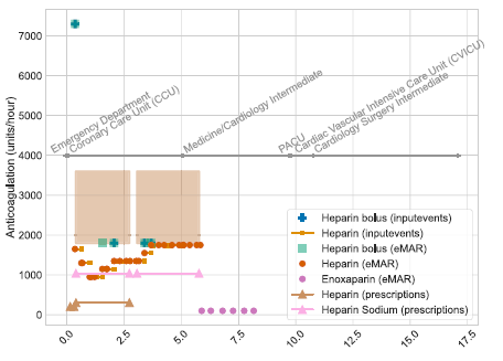 - 5일차에 이 환자는 헤파린의 two active prescription을 받았는데, 하나는 갈색 상자의 1600-3500 용량 헤파린, 다른 것은 핑크삼각형의 1000 용량을 받았다. 추가적으로 emar(오렌지색 원)에 따른 헤파린 투여를 받았고, 즉시 심장 병동으로 이동함