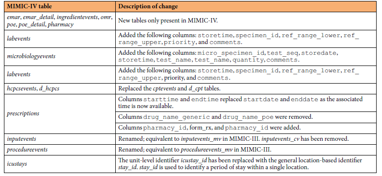 - MIMIC-III와 동일한 이름을 갖는 테이블은 호환된다.